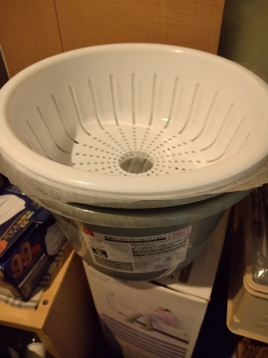 百均のザル、蓋付きのバケツのザルの真ん中にはんだゴテで穴を開け、不織布を敷いてバーミキュライトを敷き、水を吸わせて種をまく。10/17発芽、水をハイポネックス1000倍液に変えて育てる。